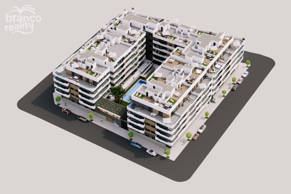 NEW BUILD RESIDENTIAL COMPLEX IN SANTA POLA New Build modern gated residential complex consisting of 1, 2 and 3 bedroom apartments and penthouses with 2 complete bathrooms. The complex consists of 4 staircases of flats with spacious landscaped communal areas, including swimming pool, relaxation area and gymnasium. All properties have been carefully designed to provide you with an exceptional living experience, with high quality finishes and a modern style. Enjoy the spacious terraces, where you can relax, enjoy al fresco dining and watch the most spectacular sunsets. The location is simply unbeatable: next to the centre of Santa Pola and the palm grove, and only a few minutes from the promenade, you will be close to a wide range of restaurants, bars and supermarkets. Excellent connection with the national road 332, which connects all the southern Costa Blanca, and with the airport in only 15 minutes.