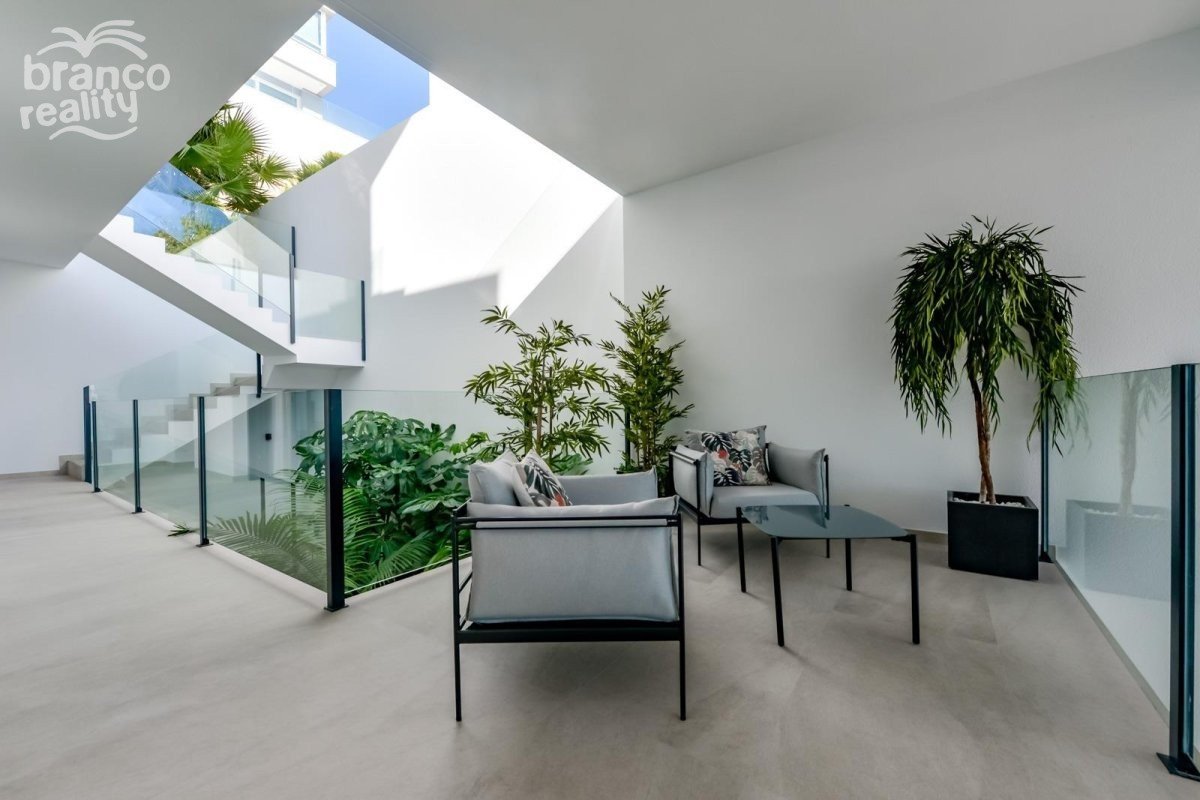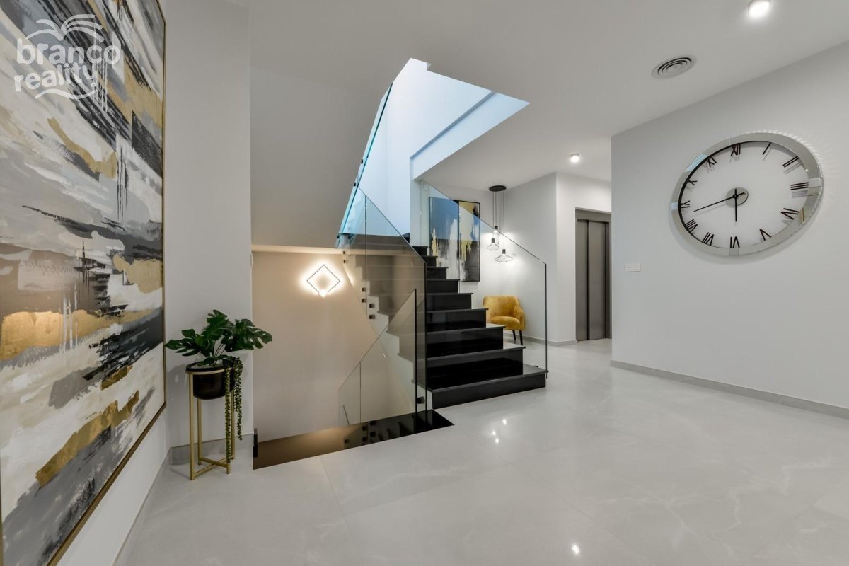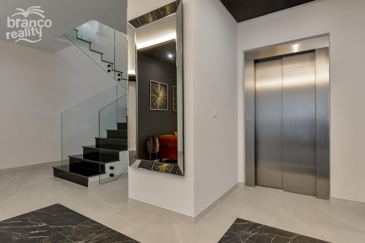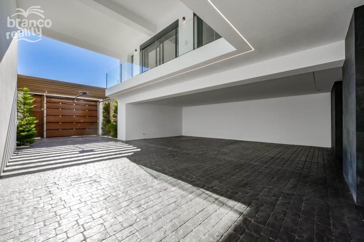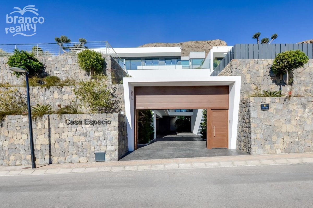 NEW BUILD LUXURY VILLA IN FINESTRAT WITH THE SEA VIEWS New Build Luxury villa with the sea views in Sierra Cortina, Finestrat. Arriving at the Urbanisation there is a natural stone wall with a height of 7 metres and the automatic access gates to the villa arriving at the covered garage at street level with double height, natural light and garden with palm trees of different heights of 180 m2, a glazed room of 78 m2 with lift, interior staircase, cloakroom and enough space to put armchairs, convert this space into an office or simply a waiting room for visitors. The next floor of 190 m2 of enclosed space is located below the plot level but 3 metres above the street level and therefore with natural light. It can be accessed by lift or staircase inside the villa, or by the staircase outside the garage, in the latter case you can only access the exterior corridors, the installations room or the main door of this floor, thus making the maintenance of the house without the need to enter inside the house. Inside this floor we will find 4 spacious bedrooms, living room with English patio of 17 m2 with the stairs to the plot, laundry, 2 bathrooms, exterior corridors of 40 m2 and installations room. When we go up to the main floor by 3 access ways we see a living room of 130 m2 with double light, open kitchen, guest toilet, panoramic sea views, and swimming pool of 54 m2 of laminate, a beautiful garden and 2 large covered terraces. To the bedrooms floor we access by lift or interior staircase where we will see a Master Bedroom of more than 50 m2 with en-suite bathroom, dressing room and terrace, two bedrooms of about 20 m2 each one, a bathroom and the terrace for these bedrooms. Villa is equipped with Led exterior and interior, underfloor heating, domotics, high Gamma crystals, centralized air conditioning, automatic blinds, high ceilings and much more: Living room- 95 m2 Bedrooms- 8 (main 52 m2 and secondary 20 m2) Bathrooms- 5 Plot- 890 м2 Built- 998 м2 Swimming pool- 12 X 5 Four Floors Garden (20 m2) - fully finished with automatic irrigation system Lift (Otis) inside the house Underfloor heating Domotics (control of air conditioning, underfloor heating, interior and exterior lighting, blinds) Electric blinds Exterior and interior lights brand name Siemens High ceilings up to 3,20 m high Impressive sea view One floor for guests Aerothermal heating Fully fitted kitchen with island Fitted wardrobes Porcelain tiled floor Wall with natural stone hand carved Garage for 4 vehicles with automatic doors 160 m2 + entrance hall 78 m2 Open parking 37 Villa located in the Sierra Cortina resort complex, next to two golf courses, theme parks, a large shopping centre and a few minutes from the beaches of Benidorm. Finestrat located in the Marina Baixa region of the Costa Blanca, close to neighbouring Benidorm and about 40 kilometres from the city of Alicante and the international airport. The village is situated on the mountainside of Puig Campana and offers beautiful views of the mountains, the coast and the Mediterranean Sea.