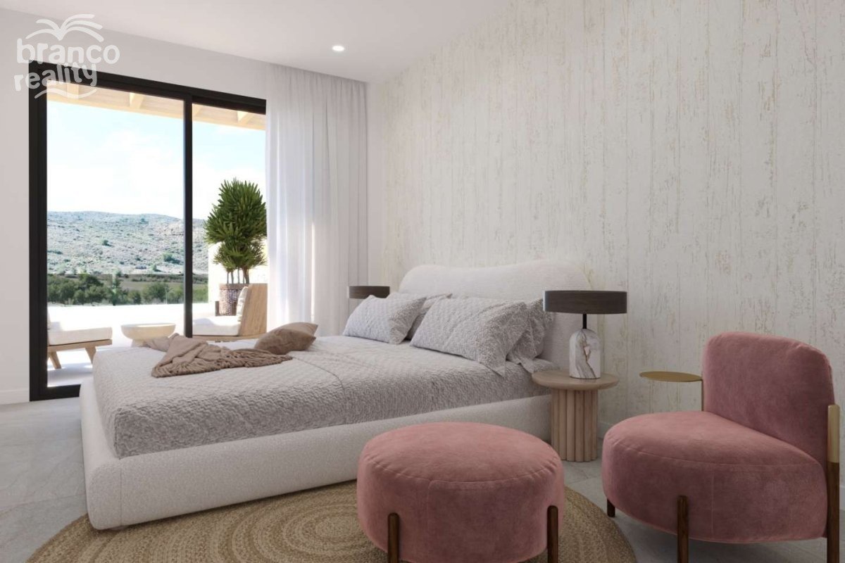 Welcome to your new dream home on the edge of the stunning Font del Llop golf course – a place where comfort, luxury, and nature come together. These modern semi-detached villas are stylishly designed and offer everything you need to fully enjoy Mediterranean living. Each home features a private garden with swimming pool, a spacious terrace with breathtaking views, on-site parking, and an elegant living space. Inside, you’ll find three comfortable bedrooms, three bathrooms with underfloor heating, a separate guest toilet, and a fully equipped kitchen with high-end built-in appliances. Air conditioning is included to ensure optimal comfort all year round. Font del Llop is nestled in a natural valley and offers an impressive landscape of streams, lakes, and green areas – ideal for golf enthusiasts, hikers, and mountain bikers. The 18-hole golf course challenges both professionals and amateurs and forms the vibrant heart of the resort. You’ll also be spoiled when it comes to dining. The resort features a stylish restaurant where you can enjoy refined Spanish cuisine and local wines on a sun-drenched terrace with panoramic views. In addition, there’s a comfortable Club House with changing rooms, a Pro-Shop, and ample parking facilities. The location is also excellent: just a short drive from both Alicante city center and the airport, and close to the white sandy beaches of the Costa Blanca. The region enjoys more than 300 days of sunshine per year and an average annual temperature of 18°C – perfect for an active and relaxed lifestyle. Discover the countless Blue Flag beaches, nature parks, rich cultural offerings, and lively local festivals of the province. Font del Llop is more than just a place to live — it’s a way of life. Prices subject to availability. Contact us for more information.