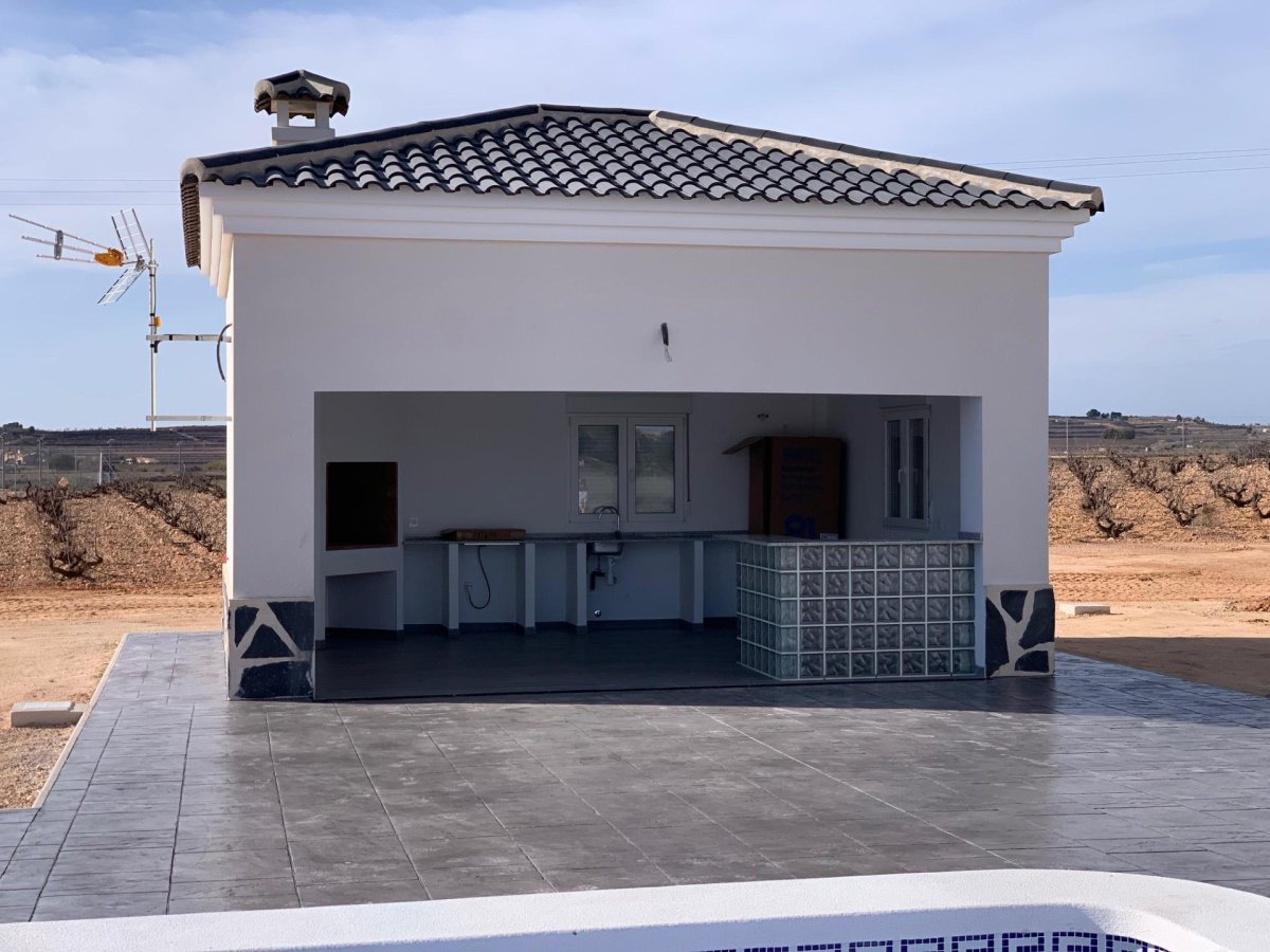 NEW BUILD VILLAS IN PINOSO You can choose Villas with traditional Spanish touches or super modern finishing, bright and clean. Different legal building plots available (rustic with minimum 10.000 m2), some walking distance to town, some totally private and our most popular ones are within 5-10 mins drive to a town. We have a plot for every taste, all with amazing views and all have mains water + electric included in the price and high speed internet available. From the biggest and best builder in the area and use top quality materials for a perfect finish. All houses include 2m stamped concrete terrace around the pool (colour and pattern to choose), 1m around the house, gated entrance, 3.000 m2 fencing, pre-installed ducted aircon, standard kitchen, security door, german tilt and turn windows (or sliding if prefered), built-in fireplace and chimney, pre-installation for tv and internet, gravel driveway plus a few meters around the house, septic tank. Bathrooms include a shower column, shower tray or bath, sink units (various colours to choose from) with sinks, taps and mirrors, plus a big selection of wall tiles. Wide selection of ceramic floor tiles, different colours, wood effect, etc. Kitchens include cabinets with standard doors and handles, as per plans provided, stainless steel sink and tap, pre-installation for oven, dishwasher, extractor. Various granite worktops to choose from included in the budget, other stone worktops available as extras. White goods not included. Marble staircase (cream, white, or grey) and railings included, plus railings for the front porch. Big fixed glass window on the staircase for extra light. Choice of tiles and steps design for swimming pool. Choice of the granite for the houses' exterior steps and window sils. You can customise the house to suit, most internal changes are free of charge, the houses can be extended and we can even build your own design. Upgrade to bigger pool, single or double garage, guest house, etc. at an extra cost. The beautiful and thriving town of Pinoso is approximately 45 minutes inland from Alicante and the white beaches of Costa Blanca and close to the Murcia, Alicante border It has a population of just under 8,000. Pinoso, also known as El Pinos is named after the pine trees that cover the areas mountain ranges. Pinoso provides a Spanish rural lifestyle, no traffic lights, hardly any traffic, practically the only jams are caused by the tractors taking the grapes to the Bodega. The fields are planted with vines, almonds and olives. In February the fields are filled with pink almond blossom. Pinoso has many bars, restaurants and shops, a new 24 hour medical centre, dentists, two primary schools and 1 secondary school, a theatre. There's an excellent Sports Centre with outdoor swimming pools, tennis courts, football pitches and gymnasium, library and many other facilities including a beautiful picnic area among the pines, complete with barbecues, seating areas and running water.
