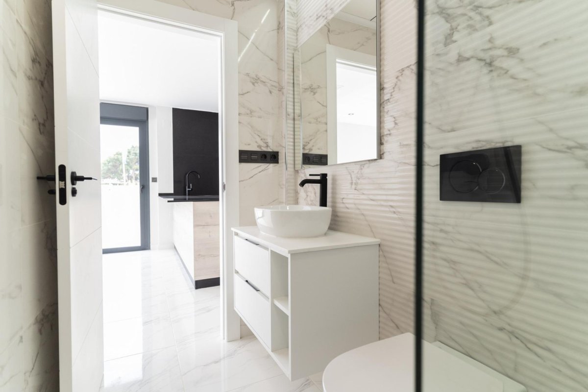 NEW BUILD RESIDENTIAL COMPLEX IN PUNTA PRIMA New Built residential complex of bungalow apartments and 7 detached villas in Punta Prima. New Build villas are distributed over two floors, plus the sunny roof terrace. On the ground floor there is a bright and spacious living room with its open plan kitchen, 1 bedroom with fitted wardrobe and 1 bathroom. On the first floor you can find other 3 bedrooms with fitted wardrobes and 2 bathrooms, from wich one en-suite with the main bedroom. From the main bedroom you can access a terrace. Stairs up you reach private solarium. The urbanization will offer nice green areas with a playground for children, a gym and two communal pools. Complex located a few meters from the centre of Punta Prima where you will find all the amenities you may need. In the surroundings you will find a wide range of nice restaurants, cafes, supermarkets, pharmacies and all the amenities you may need. Punta Prima, located just 5 km from Torrevieja, is characterized by good communication and health infrastructures, the proximity to Alicante airport, and the number of services open throughout the year. Just 10 km away we can find the golf courses of Villamartín, Campoamor, Las Ramblas, Las Colinas and Lo Romero, as well as the commercial centres of La Zenia and Habaneras.