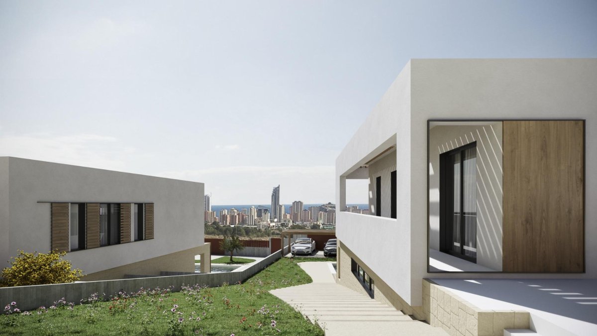 NEW BUILD VILLAS IN FINESTRAT New Build Modern villas in Finestrat. Villas with3 bedrooms and 3 bathrooms, open plan kitchen with lounge area, terrace with magnificent views over Benidorm, private garden with swimming pool and parking space. It is conceived as a fully walkable space with interior and exterior pathways that provide independent access to each floor. This design offers various perspectives of the architectural complex and its surroundings, with the sea and Sierra Cortina serving as a picturesque backdrop. The main entrance to the villa is located at the lower part of the plot, featuring ample parking for two vehicles. A water feature with lounge chairs introduces you to the ground floor, characterized by wide walls adorned with masonry. Extending seamlessly from the living room is a terrace, made possible by a large folding window. Wooden shutters on masonry walls provide a partially covered outdoor area for added comfort. The pool, with its aquamarine hues and gresite lining, sits adjacent to a pavement area crafted from non-slip porcelain tile with a wood-like appearance. This space also includes a barbecue area that can be customized to suit the user’s needs, with access from a paved zone through the natural terrain. Finestrat located in the Marina Baixa region of the Costa Blanca, close to neighbouring Benidorm and about 40 kilometres from the city of Alicante and the international airport. The village is situated on the mountainside of Puig Campana and offers beautiful views of the mountains, the coast and the Mediterranean Sea. Benidorm is just a five-minute drive from the properties and offers all the services you would need including shops, bars, restaurants, supermarkets, banks, pharmacies and several private international schools.