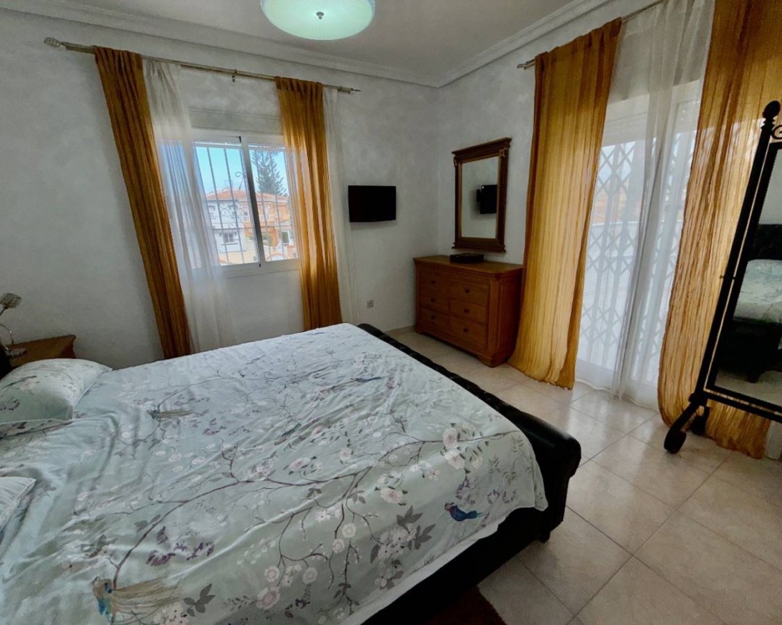 This excellent-condition, east-facing villa offers a perfect blend of comfort, space, and convenience, ideally located within walking distance to amenities and just 10 minutes from the beach and golf courses. The property features three spacious bedrooms, all with fitted wardrobes, and three modern bathrooms, making it ideal for families, holiday living, or investment. The open-plan living and dining area is bright and welcoming, enhanced by a fireplace and large windows overlooking the private pool and gardens. The villa benefits from two kitchens, including a stylish American kitchen fully equipped with white goods, offering flexibility for entertaining or extended family use. Additional practical spaces include a utility room and ample storage throughout. Outdoor living is a highlight, with private landscaped gardens, a private swimming pool, and relaxing pool views. Comfort is ensured year-round with air conditioning and ceiling fans. Additional features include off-road parking, a garage, and one dedicated parking space. Furniture is negotiable, allowing buyers to personalize the home to their taste. Conveniently located: 5 minutes to amenities10 minutes to beach and golf30 minutes to the airport This villa is an excellent opportunity for a permanent residence, holiday home, or rental investment.