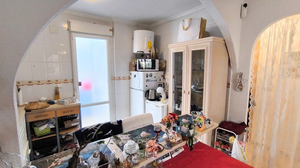 This 2 bedroom bungalow sits in the heart of the popular Lo Marabou area of Ciudad Quesada. A wide choice of supermarkets, bars, restaurants and everyday shops are just a one minute walk away, making this an ideal home for both permanent living and holidays. The property offers off-road parking at the front and is accessed via a welcoming open terrace. Inside, the bright lounge creates a comfortable living space and flows naturally into the American-style kitchen. To the rear, a useful private courtyard houses the washing machine and spiral stairs leading up to a private solarium. Up here, you will find a large wooden cabin offering excellent storage or flexible use. From the solarium, there are pleasant views across to the impressive communal swimming pool, which is conveniently located just over the road. Both bedrooms are generous in size and offer good natural light. A well-maintained family bathroom sits neatly between them, adding to the practical layout of the home. A real bonus lies beneath the property, where three spacious storage rooms provide valuable extra space rarely found in similar homes. Several golf courses are a short drive away, while the sandy beaches of Guardamar can be reached in 15 minutes. Alicante Airport is approximately a 35 minute drive, ensuring easy travel year-round. This 2 bedroom bungalow in Lo Marabu is sure to prove popular, so book your viewing today!