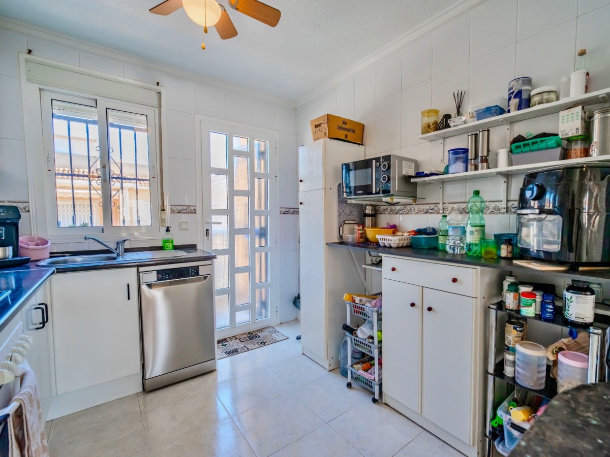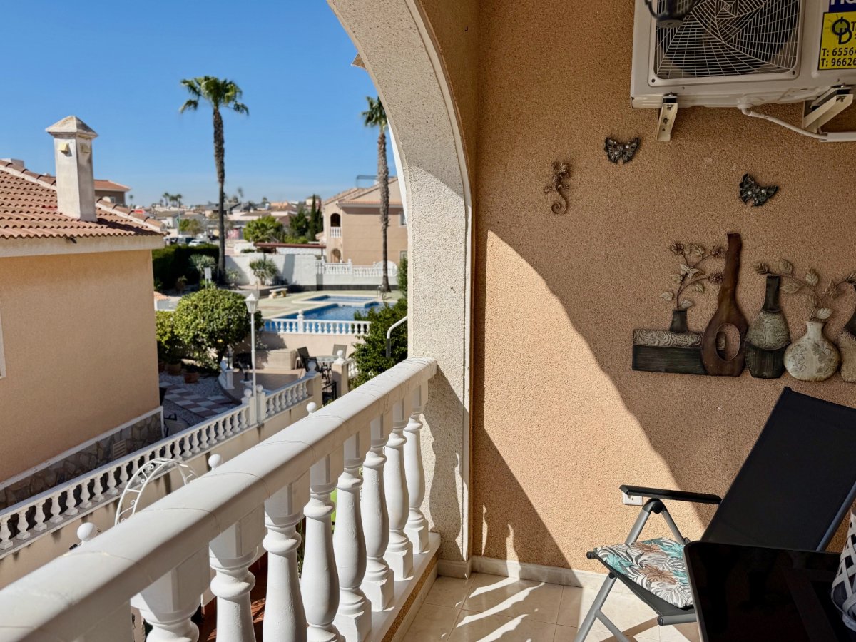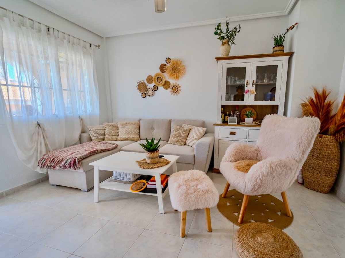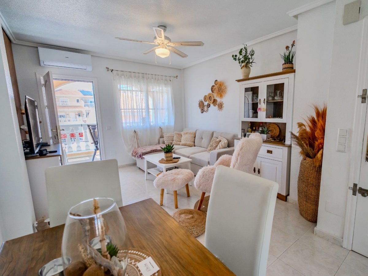 This charming top-floor apartment offers a bright and comfortable living environment with two bedrooms and two daylight shower bathrooms, one of which is a recently renovated en-suite in the master bedroom. The open-plan, fully fitted kitchen connects seamlessly with the living room, creating an inviting space filled with natural light and providing direct access to a covered balcony—perfect for relaxing or outdoor dining. Both bedrooms are equipped with built-in wardrobes, while the master bedroom also features a ceiling fan. A split air-conditioning system (hot and cold) is installed in both the living room and the master bedroom, ensuring comfort throughout the year. From the kitchen, a staircase leads to the private rooftop solarium. The staircase is shared with the neighboring apartment, but the solarium itself is for private use only. Here you will find a practical storage room housing the hot water boiler, washing machine, and additional storage space. The property forms part of a well-maintained residential community built in 1996, offering a communal swimming pool and parking spaces. Ideally located within immediate proximity to restaurants and only a few minutes from the town center of Ciudad Quesada, the apartment enjoys a sunny southwest orientation with beautiful sunsets. Built in solid construction, the apartment has a built area of 71 m² and a living area of 59 m². Energy rating: E.