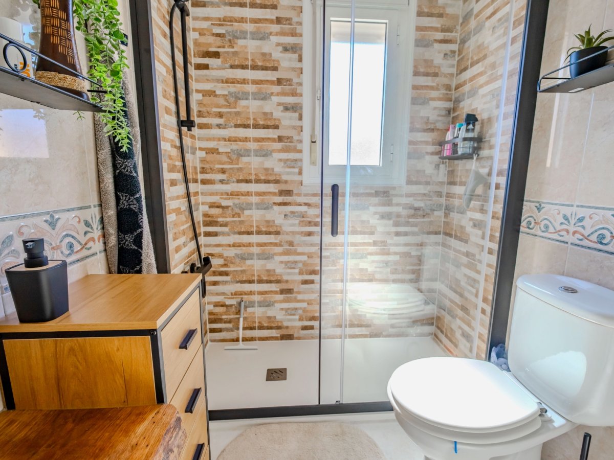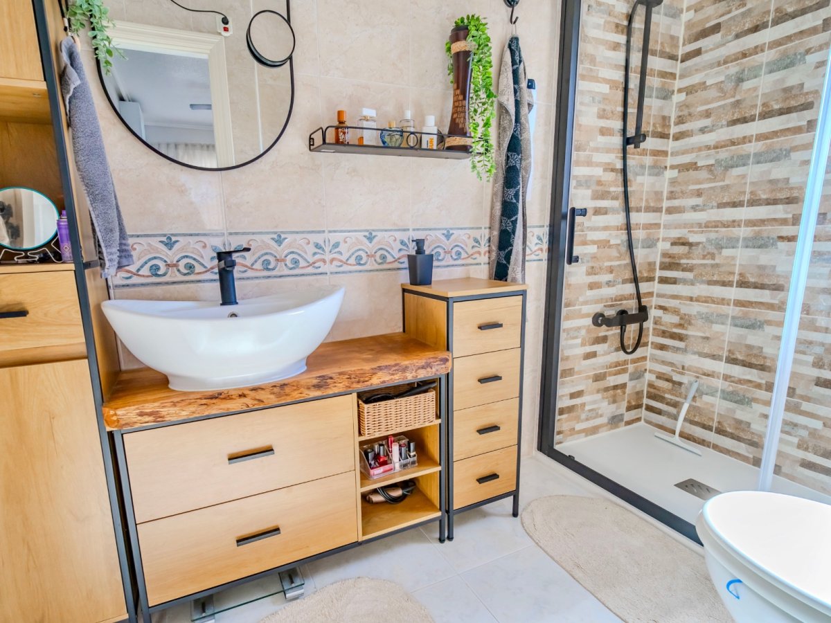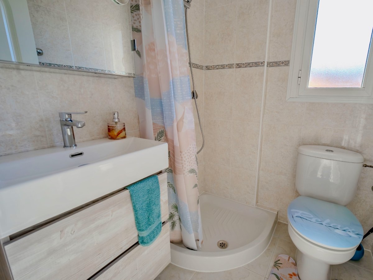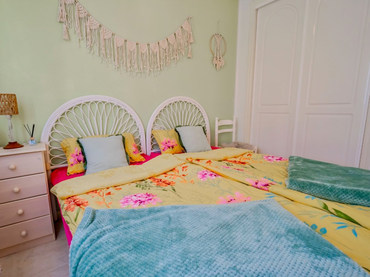 This charming top-floor apartment offers a bright and comfortable living environment with two bedrooms and two daylight shower bathrooms, one of which is a recently renovated en-suite in the master bedroom. The open-plan, fully fitted kitchen connects seamlessly with the living room, creating an inviting space filled with natural light and providing direct access to a covered balcony—perfect for relaxing or outdoor dining. Both bedrooms are equipped with built-in wardrobes, while the master bedroom also features a ceiling fan. A split air-conditioning system (hot and cold) is installed in both the living room and the master bedroom, ensuring comfort throughout the year. From the kitchen, a staircase leads to the private rooftop solarium. The staircase is shared with the neighboring apartment, but the solarium itself is for private use only. Here you will find a practical storage room housing the hot water boiler, washing machine, and additional storage space. The property forms part of a well-maintained residential community built in 1996, offering a communal swimming pool and parking spaces. Ideally located within immediate proximity to restaurants and only a few minutes from the town center of Ciudad Quesada, the apartment enjoys a sunny southwest orientation with beautiful sunsets. Built in solid construction, the apartment has a built area of 71 m² and a living area of 59 m². Energy rating: E.