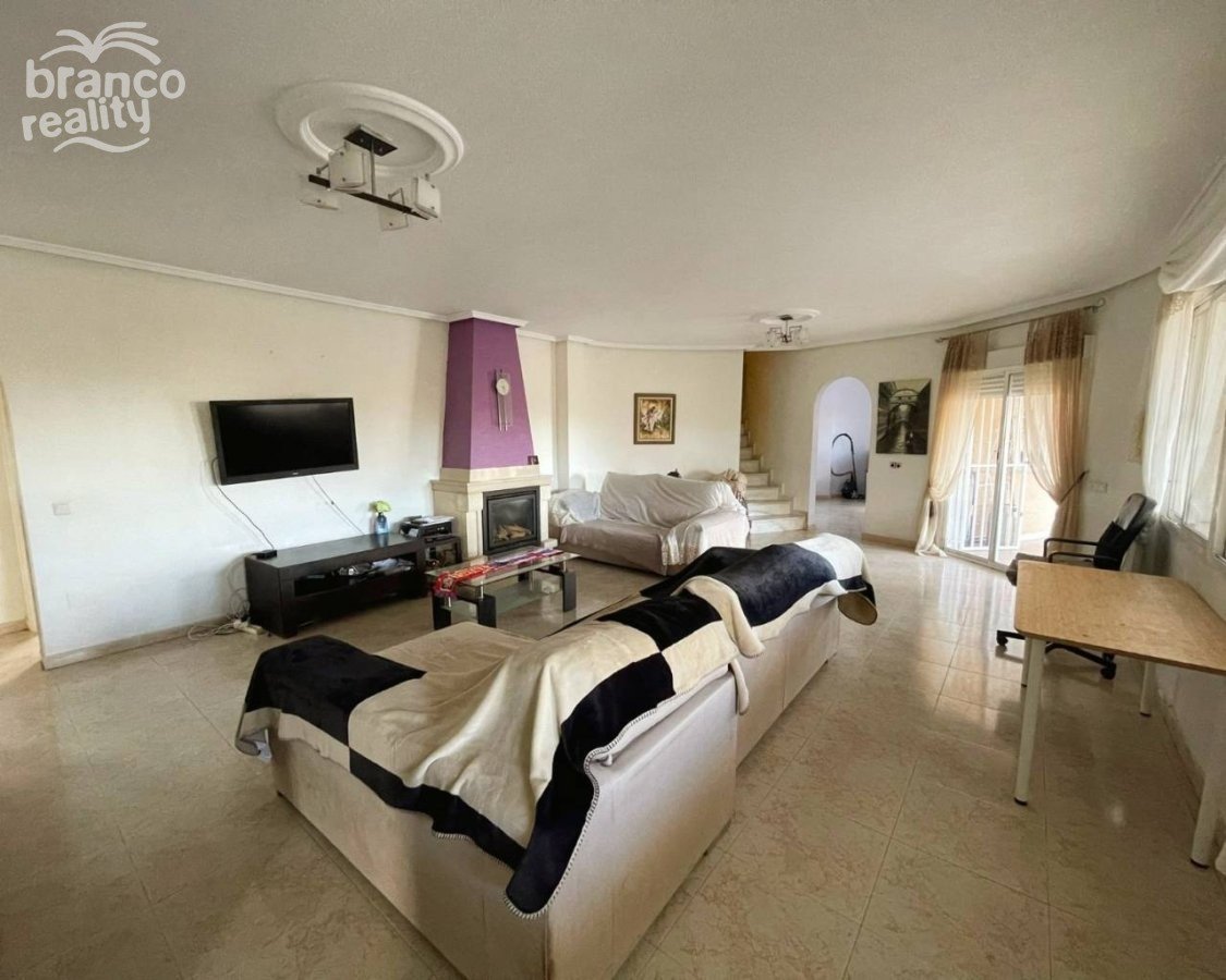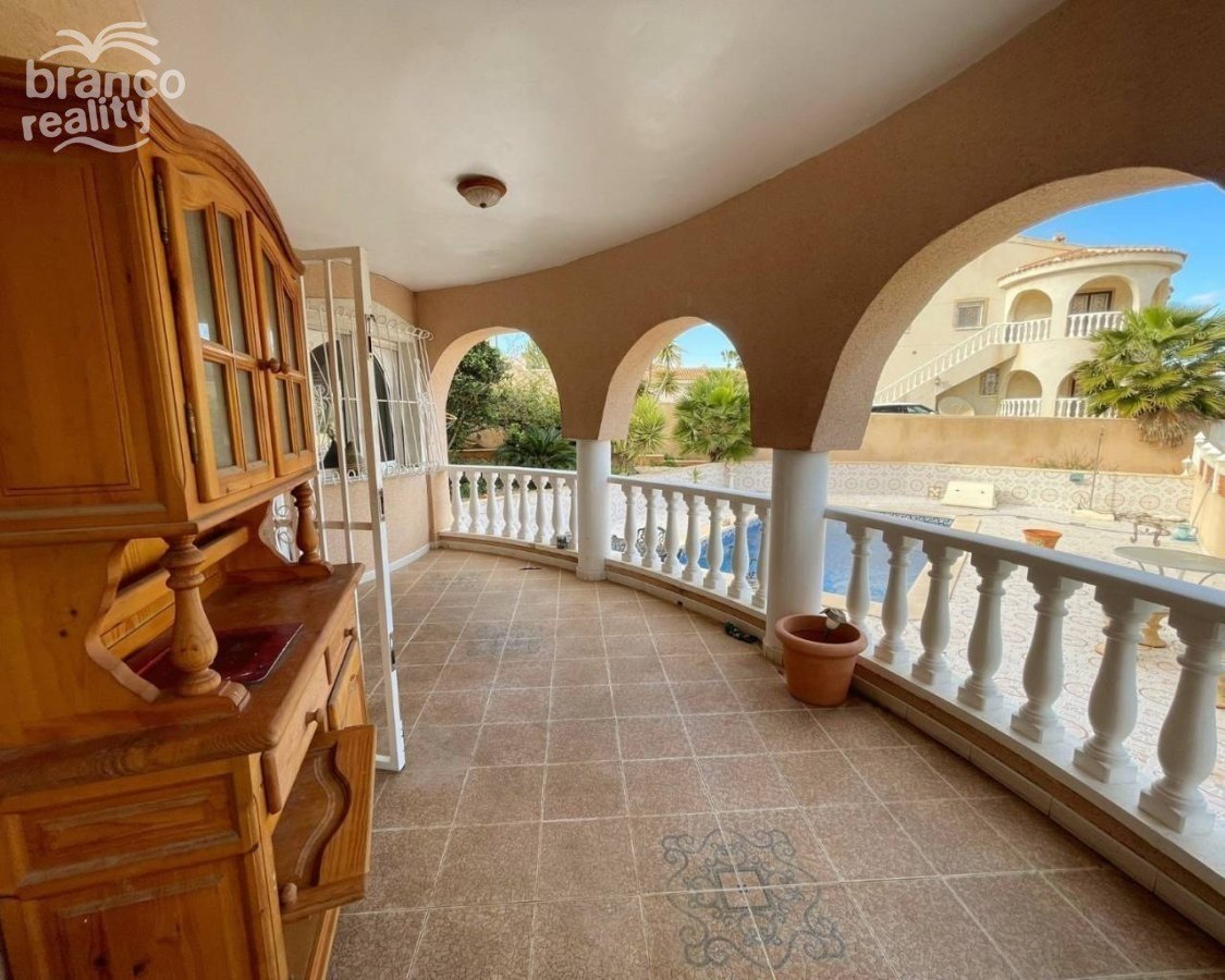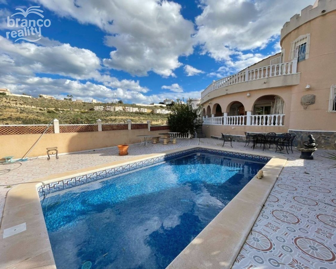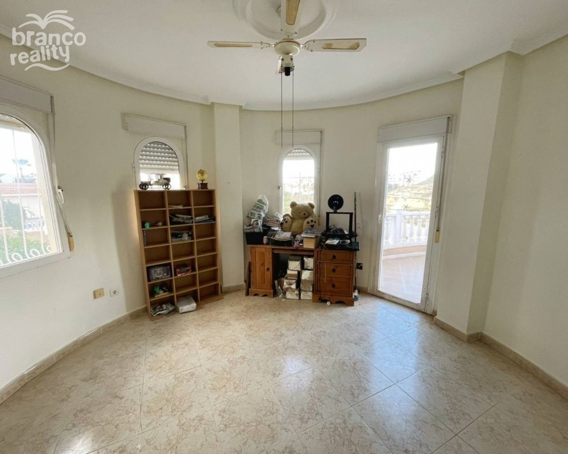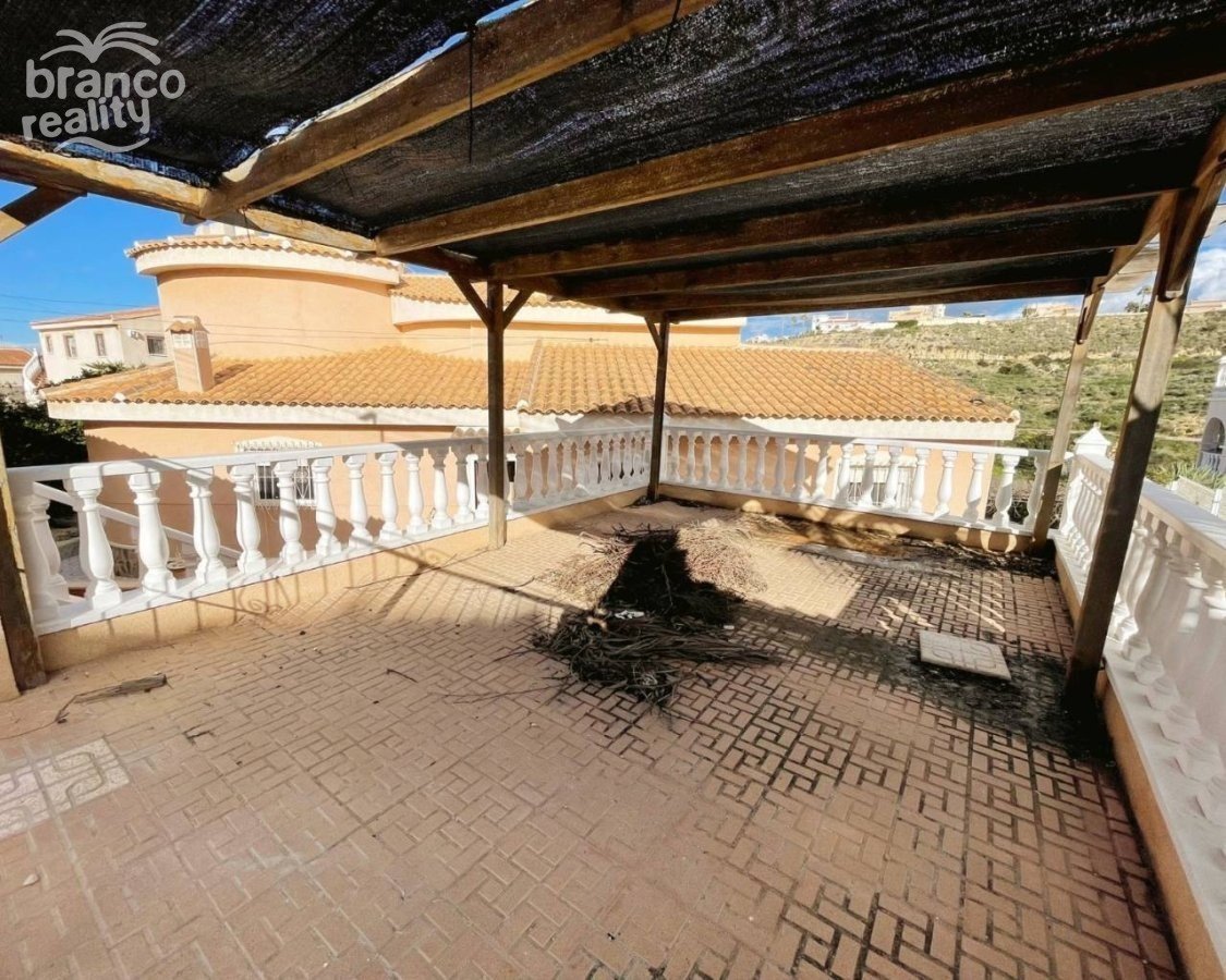 A superb large Sofia villa is presented for sale in good condition and has excellent potential for further development. The property is situated in the upper golf region of Quesada with lovely elevated views towards the golf area and further to the mountains. The property is built on a large 850m2 plot with space for off road parking ample terrace areas and a private swimming pool. The property is a classic design Sofia model with a very large lounge with a feature fireplace, a separate round dining area in the turret space. There is a large walk through kitchen and excellent potential to improve the design if required. There are 3 double bedrooms on the main floor with ensuite to master bedroom and a second family size bathroom. Glazed doors from the lounge open onto a huge curved classic arched terrace over looking the private pool and gardens, with extended views to the mountains. A feature curved staircase from the lounge leads up to a first floor turret double bedroom and a glazed door opening onto a roof terrace directly above the ground floor terrace. The views are amazing. Once again potential is available for an ensuite to this turret room within the roof space of the main villa. With the available elevation to this villa there is a large open space beneath the car port that could be used for a number of options. There is also a door from the terrace level opening up into a large under build area currently used as a separate extra bedroom and bathroom. Viewing is highly recommended to really appreciate the potential this villas has on offer.