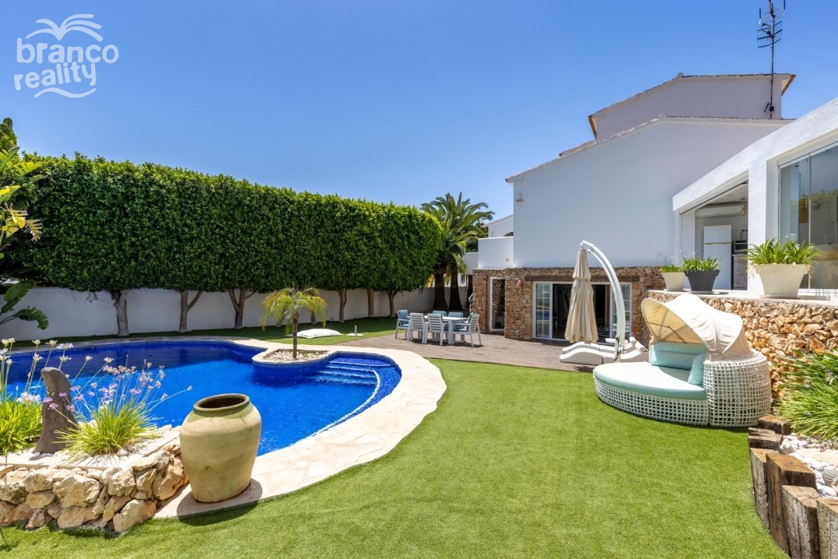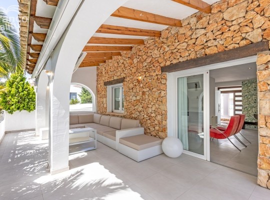 Situated third line from the sea in Moravit, Moraira, minutes away from all the amenities and beaches of Moraira, this beautiful villa with four bedrooms is perfect for family living. Constructed over three levels the villa has been lovingly reformed and designed to a high standard whilst making the most of the plot and the sea views. ACCOMMODATION: Lounge, Dining Room, Kitchen, Two Double Bedrooms, Two Family Bathrooms, INTERNAL STAIRCASE UP TO: Master Suite including Double Bedroom, Two Dressing Rooms and En-suite. EXTERNAL STAIRCASE DOWN TO: Guest Apartment with Lounge, Kitchen, Double Bedroom, Family Bathroom, Games Room and Home Cinema, Gym, Turkish Bath/Sauna, Laundry Room, Utility Room. EXTERNAL: Driveway, Carport, Covered Entrance Porch, Summer Kitchen with glass curtains, BBQ, 16 x 6m Freeform Pool, Jacuzzi, Two Balcony Terraces, Garden. FULL DETAILS For sale in Moravit, Moraira is this beautiful high quality reformed villa with lovely sea views, situated just minutes´ walk from all the amenities and beaches of Moraira. Constructed over three levels the property is accessed through electric gates to the driveway which offers plenty of parking space. A few steps lead up to the entrance porch and main entrance. On this level is the spacious lounge and dining room and a fully equipped kitchen designed in red with an integrated oven, dishwasher and a central island with electric hob and extractor hood. There are two double bedrooms and two separate bathrooms with showers. Also on this level is access to the lovely covered terrace overlooking the immaculate garden. An internal staircase leads up to the stunning and spacious master suite which has the bedroom and two ample dressing rooms and an en-suite with a large circular corner bath, spa shower and double vanity unit with basins. The lower level has a spacious guest apartment with lounge, kitchen, a double bedroom and a bathroom with shower. There is a games room complete with a pool table and home cinema and a gym with Turkish bath/sauna. The laundry room and utility room are also on this level and there is direct access out to the garden. Externally, the villa has been attractively designed using stonework, decking and artificial grass around the 16 x 6m freeform pool and jacuzzi. From the poolside steps lead up to an amazing summer kitchen with glass curtains and a central design fireplace ideal for all year round entertaining. This is a beautifully designed and reformed villa in an excellent location. If you like what you see, contact us to arrange a viewing.
