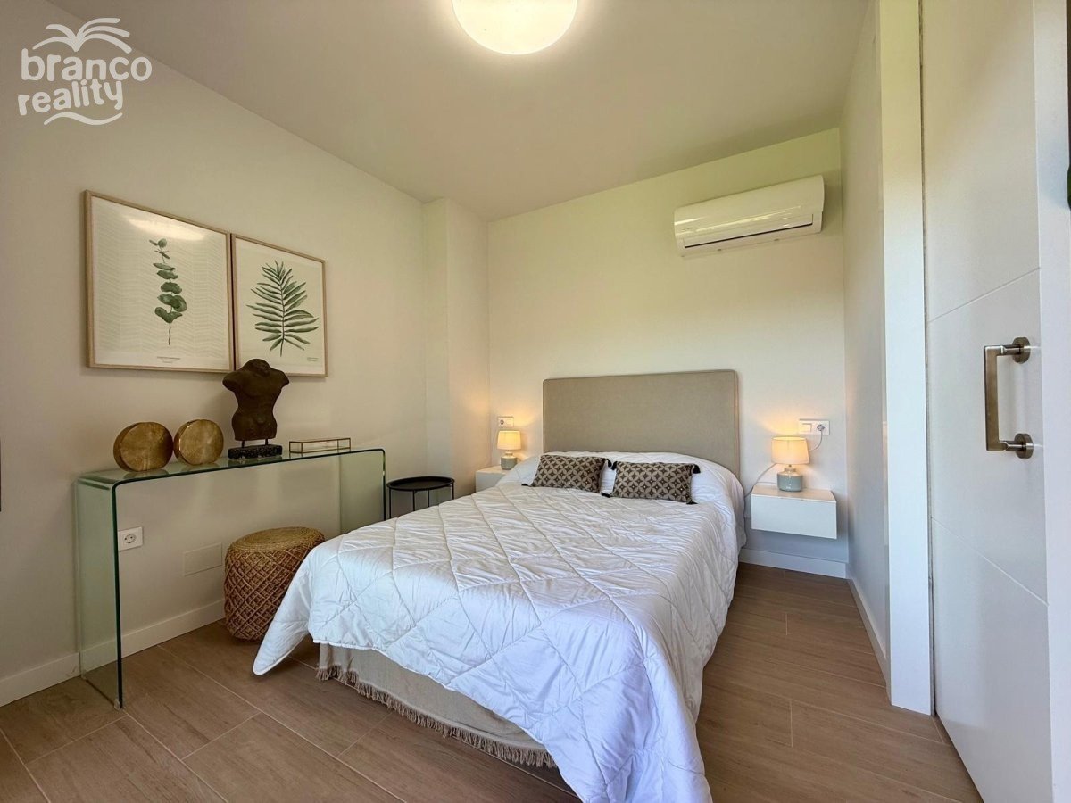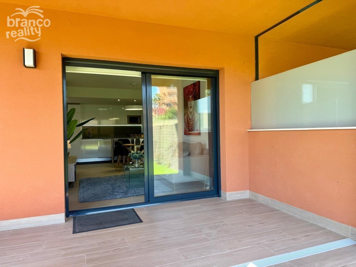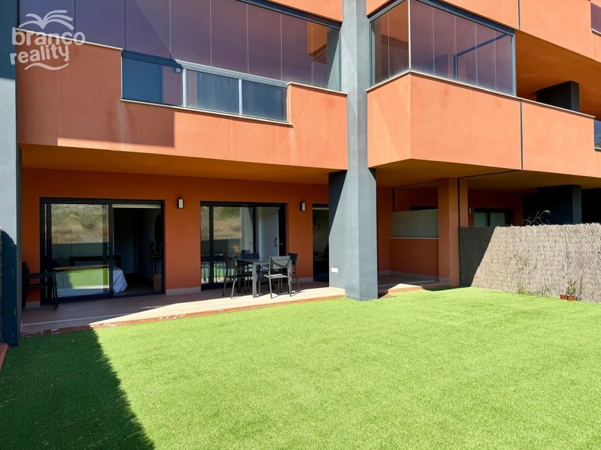 Moderní byt v přízemí s velkou zahradou orientovanou na východ, která je sluncem svítit až do časného odpoledne. Na západní straně pozemku se nachází další soukromá terasa s dlažbou. Nemovitost má prostorný obývací pokoj, jídelnu a americkou kuchyň, 2 dvoulůžkové ložnice a 2 koupelny. Nemovitost se prodává s nábytkem (podléhá inventáři), klimatizací, podzemním parkováním a přístupem k velkému společnému bazénu. Cena: 275 000 €. Poplatky za komunitu: 1 000 € ročně.
