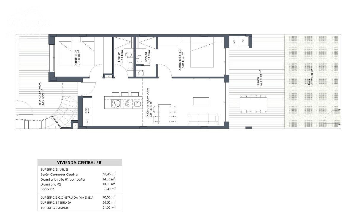 Novostavby bungalovů v San Miguel de Salinas - Příroda, golf a pohodlí Výhodná poloha v přírodním prostředí Tato exkluzivní rezidence nově postavených bungalovů se nachází necelé 3 km od San Miguel de Salinas, v klidné oblasti obklopené přírodou a s působivým ničím nerušeným výhledem. Díky své vynikající poloze si můžete vychutnat klid, aniž byste se museli vzdát blízkosti všech služeb. Pouhých 7 km odtud se nacházejí pláže Orihuela Costa a město Torrevieja, kde si můžete užít širokou škálu volnočasových aktivit, gastronomie a obchodů. Moderní design a ničím nerušený výhled Nemovitosti jsou navrženy v moderním stylu a mají vysoce kvalitní interiérové i exteriérové úpravy. Můžete si vybrat mezi: Přízemí se soukromou zahradou, ideální pro ty, kteří si chtějí užít venkovní pobyt. Horní patra se soukromým soláriem, ideálním pro opalování a relaxaci s panoramatickým výhledem. Kromě toho všechny domy zahrnují vyhrazené parkovací místo. Společné prostory pro maximální pohodlí Komplex nabízí krásný společný bazén obklopený zelení, ideální pro užívání si středomořského klimatu. Přírodní prostředí podporuje zdravý životní styl, daleko od stresu a znečištění, v enklávě, která připomíná skutečný ráj. Blízkost nejlepších golfových hřišť San Miguel de Salinas je ideální destinací pro milovníky golfu. Necelé 4 km daleko se nacházejí tři z nejprestižnějších hřišť na Costa Blance: Villamartin Golf - 3,5 km. Las Colinas Golf & Country Club - 4 km. Campoamor Golf - 4 km. Spojení s hlavními zajímavostmi Tento rezidenční komplex se nachází na strategickém místě se snadným přístupem k: San Miguel de Salinas - 3 km. Pláže Orihuela Costa - 7 km. Torrevieja - 7 km. Nákupní centrum La Zenia Boulevard - 10 km. Letiště Alicante - 55 km. Letiště Murcia (Corvera) - 50 km. Zajistěte si domov v San Miguel de Salinas Pokud hledáte domov na Costa Blance, kde si můžete užít klid, přírodu a golf, tento rezidenční komplex je tou nejlepší volbou. Kontaktujte nás ještě dnes pro více informací a pro domluvení prohlídky.