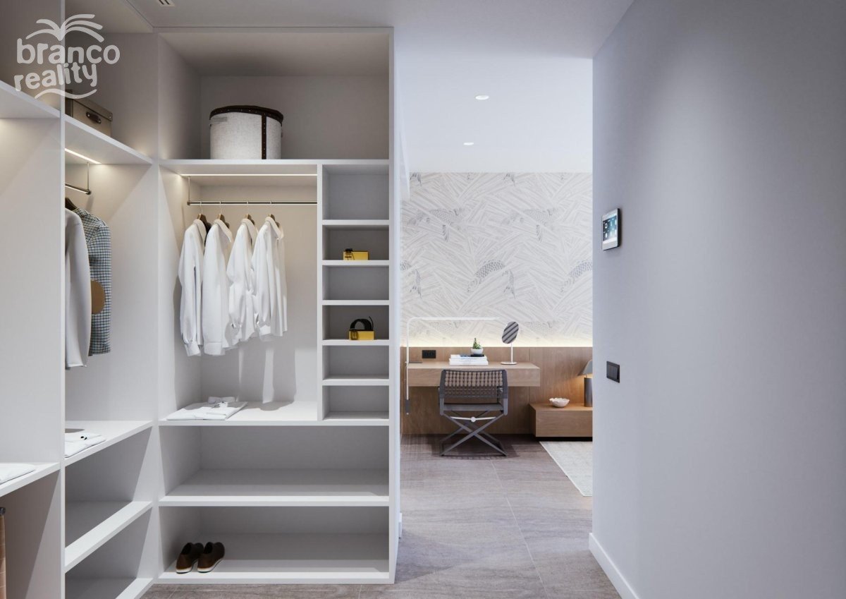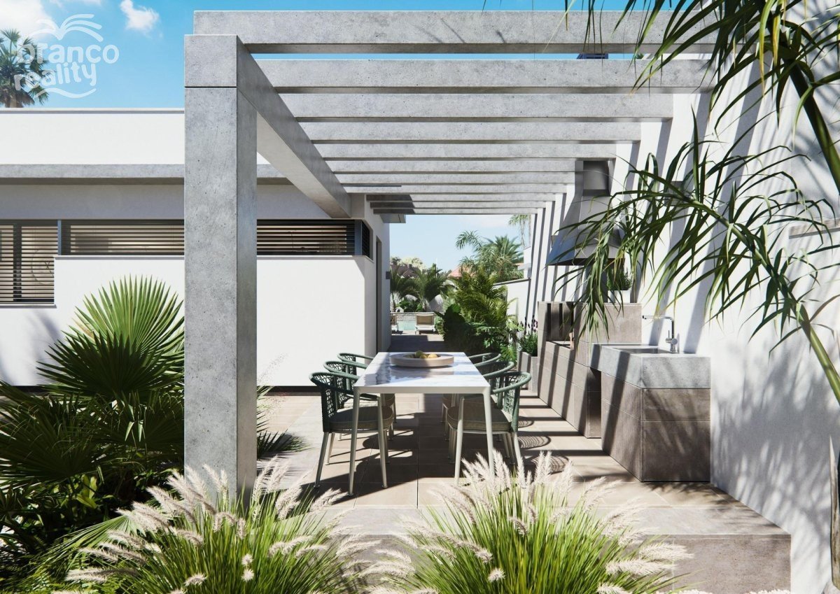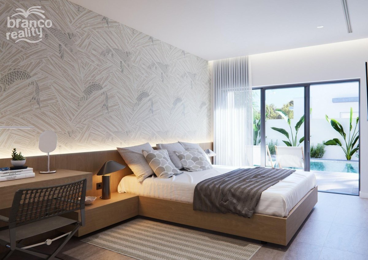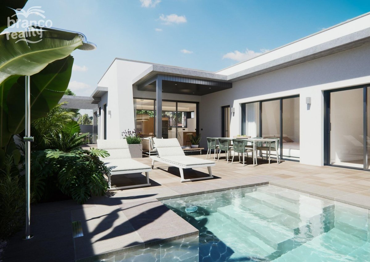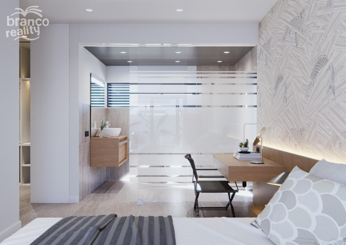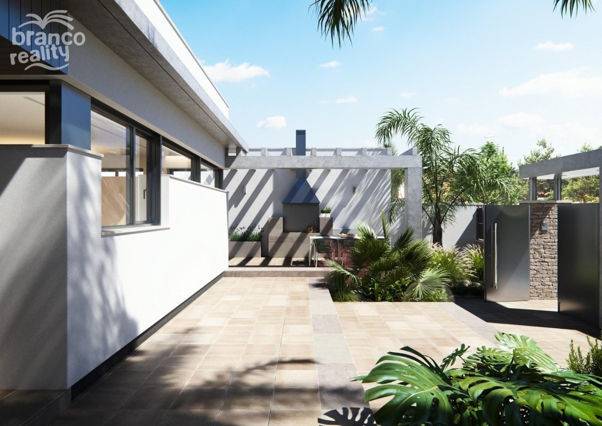 NOVOSTAVBA VILLY NA PATŘE Tři exkluzivní vily v rezidenční čtvrti v San Javier s pozemkem o rozloze 600 m2 a zastavěnou plochou o rozloze 217 m2 na jednom patře, soukromým bazénem a rozlehlými zahradami. Rezidenční dům s architektonickým designem založeným na čistých, kubických a funkčních liniích v exkluzivní rezidenční enklávě v San Javier (Murcia). Automatizované přístupové brány do zahrady a garáže s infračerveným dálkovým ovládáním. Velká krytá garáž pro dvě vozidla se samostatným vjezdem. Zahrady s odvodňovacím systémem na patře, kompletně dokončené a přizpůsobitelné včetně vegetace, zavlažování a osvětlení.