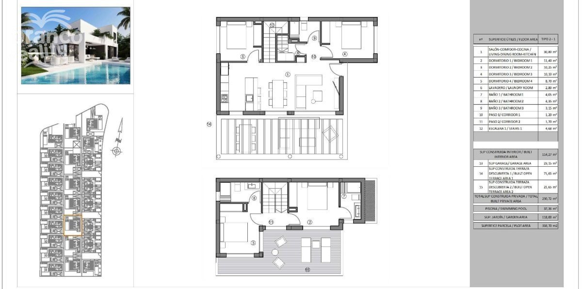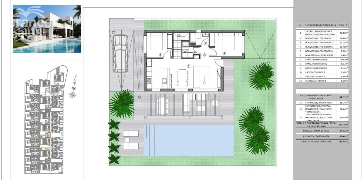 Exkluzivní rezidenční komplex v Sierra Cortina, Benidorm-Finestrat Objevte tento nový luxusní rezidenční komplex v Sierra Cortina, Finestrat, jedné z nejexkluzivnějších oblastí Costa Blanca. Tento komplex nabízí 30 vil avantgardního designu s možností dvojdomků a samostatných vil, všechny s nádherným výhledem na moře a hory. Tento komplex se nachází v klidném prostředí, přesto v blízkosti veškeré občanské vybavenosti, a je ideální pro ty, kteří hledají soukromí, pohodlí a přístup k nejlepším plážím a službám v Benidormu. Moderní design a prostorné bydlení Vily byly navrženy v moderním stylu s optimalizovaným přirozeným světlem a panoramatickým výhledem. Budete si moci vybrat z různých modelů s variantami od 2 do 4 ložnic a některé designy zahrnují suterén s anglickou terasou, což umožňuje přidání dalších ložnic. Každý dům má: 2 podlaží se soukromými terasami s výhledem na moře. Soukromý bazén a zahrada pro vaše potěšení. Garáž na pozemku s prostorem pro vaše vozidlo. Otevřená kuchyň integrovaná do obývacího pokoje. Vestavěné skříně a úložný prostor. Technická místnost pro pohodlí. Výhodná poloha na pobřeží Costa Blanca Tento exkluzivní rezidenční komplex se nachází v Sierra Cortina, jedné z nejprestižnějších oblastí Costa Blanca, obklopený přírodou a s přístupem k prvotřídním službám. Pouhé 3 km od moře, tento komplex se nachází vedle dvou golfových hřišť a nedaleko zábavního parku Terra Mitica a luxusního hotelu Asia Gardens. Nabízí také rychlé spojení na hlavní silnice a letiště v regionu. Vzdálenosti k hlavním zajímavým místům Pláže Benidorm - 3 km. Golfová hřiště Villaitana a Sierra Cortina - 2 km. Nákupní centrum La Marina - 2 km. Zábavní park Terra Mitica - 1,5 km. Letiště Alicante - 40 km. Bydlete v exkluzivní oblasti se všemi vymoženostmi Finestrat je okouzlující obec v Marina Baixa, která se nachází jen pár minut od Benidormu. Kombinace hor a moře spolu s moderní infrastrukturou z něj činí bezkonkurenční místo pro bydlení nebo investici. Nenechte si ujít příležitost pořídit si zbrusu novou vilu v této privilegované lokalitě. Kontaktujte nás ještě dnes pro více informací a pro domluvení prohlídky.