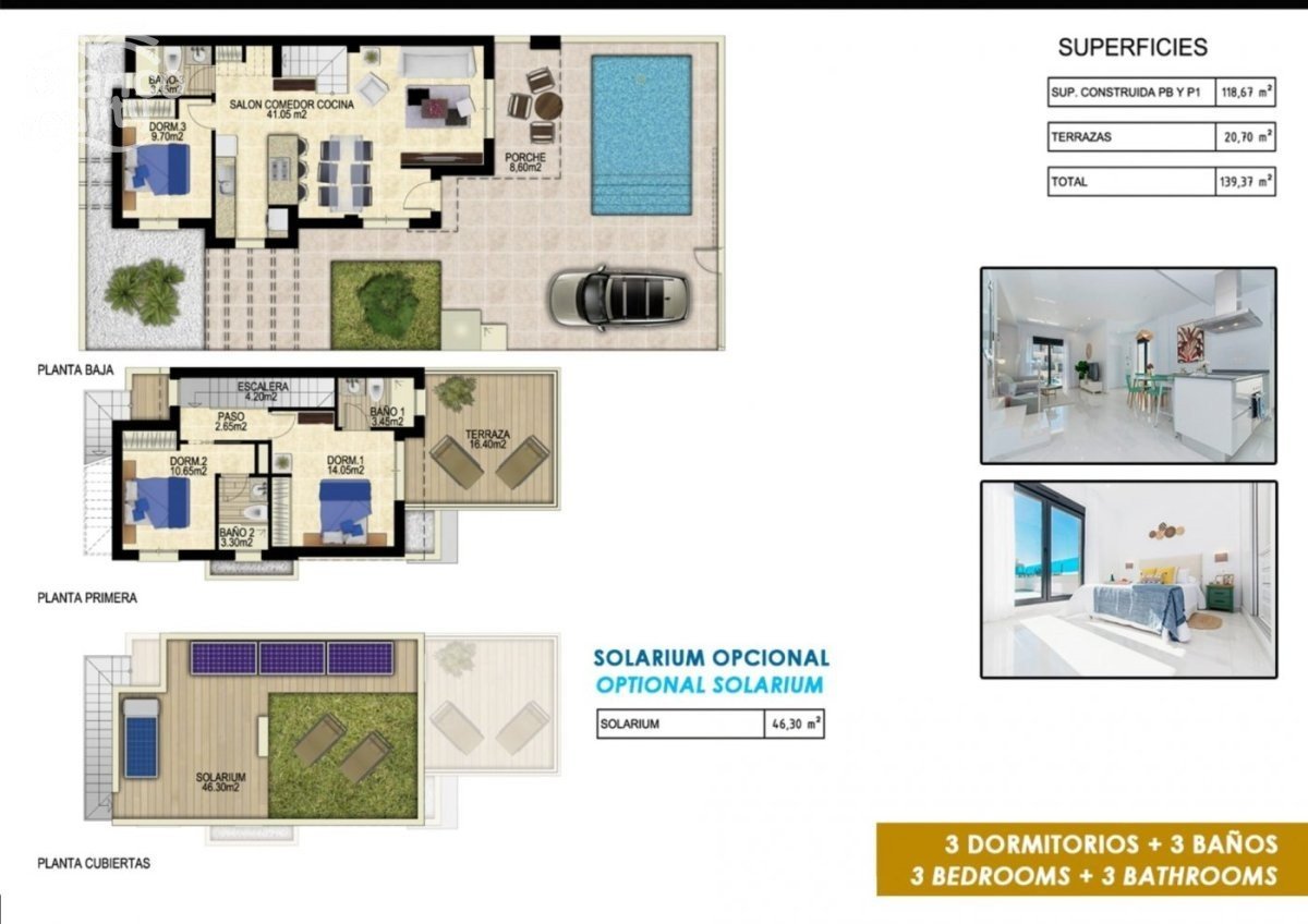 NOVOSTAVBY VILY V GOLFOVÉM REZORTU VISTABELLA Novostavby luxusních vil o 2 podlažích se nacházejí v golfovém resortu Vistabela, mezi San Miguel a Los Montesinos v Orihuela Costa. Vily se 3 ložnicemi, 3 koupelnami, otevřeným obývacím pokojem s kuchyní, soukromou zahradou s bazénem a parkovacím místem. Za příplatek je možné využít soukromé solárium. V golfovém resortu Vistabella je místo pro každého. Hřiště je navrženo tak, aby si ho každý hráč mohl užít od začátku do konce. Jeho zvlněné ulice, strategicky umístěné bunkry nebo jezera jsou některé z prvků, které z něj činí jeden z nejatraktivnějších designů v oblasti, kde je každý úder výzvou a potěšením pro smysly. 18 jamek golfového hřiště Vistabella, par 72 a délka více než 6 000 metrů byly navrženy podle pokynů moderních hřišť se 4 odpališti s velkou amplitudou na každé jamce, širokými fairwayemi a vyvýšenými bunkry. Klubovna a restaurace Vistabella Golf a místní bary a obchody jsou vzdáleny do 5 minut chůze. Rušná města San Miguel de Salinas a Los Montesinos jsou vzdálena 5 minut jízdy autem a krásné pláže oceněné modrou vlajkou v Guardamaru jsou vzdálené pouhých 15 minut jízdy autem. Letiště Alicante je vzdálené 35 minut a nové letiště Corvera Murcia 45 minut jízdy.