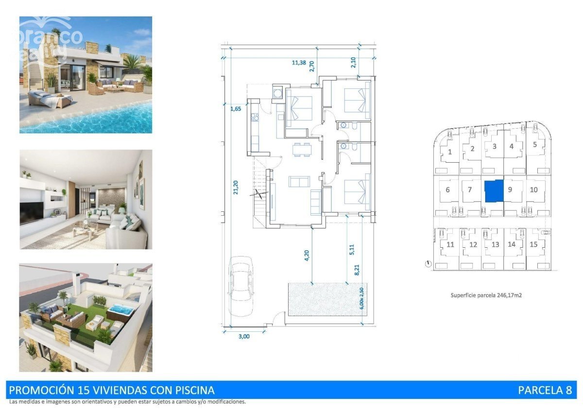Novostavby vil s vlastním bazénem v Oasis de la Marina, Costa Blanca Moderní domy v klidné lokalitě poblíž pláže Objevte tento exkluzivní komplex 15 samostatně stojící a dvojdomkové novostavby vil, které se nacházejí v rezidenční čtvrti Oasis de La Marina v obci San Fulgencio. Tyto elegantní, moderně navržené domy jsou postaveny na jednom podlaží a nacházejí se pouhých 4,5 km od nádherných pláží Costa Blanca. Ideální místo pro trvalé bydlení i rekreační pobyty v klidné, ale dobře dostupné oblasti. Funkční uspořádání a design pro maximální pohodlí Každá vila má praktické a světlé uspořádání, navržené pro užívání si středomořského životního stylu: 3 ložnice s vestavěnými skříněmi 2 koupelny s nábytkem a skleněnými zástěnami Plně vybavená kuchyň s digestoří a osmózou Prostorný obývací pokoj s jídelnou a přímým vstupem do zahrady Soukromé solárium Soukromá zahrada s bazénem a soláriem Parkovací místo na pozemku Kompletní vybavení a energetická účinnost Tyto vily jsou navrženy s použitím vysoce kvalitních materiálů a energeticky úsporných řešení: Systém klimatizace s ohřevem a chlazením Instalace fotovoltaických solárních panelů Vnitřní a venkovní LED osvětlení Elektrické hliníkové žaluzie Soukromý bazén v každé nemovitosti Soukromé parkování na pozemku Přírodní prostředí a vybavení v okolí Oasis de La Marina je klidná rezidenční oblast obklopená přírodou, mezi městy San Fulgencio, La Marina a Guardamar del Segura. Poloha nabízí blízkost veškerého potřebného vybavení pro každodenní život, stejně jako možností pro volný čas a sport. Zajímavosti v okolí: Nejbližší pláž: 4,5 km Golfové hřiště La Marquesa: 6 km Nákupní centrum Habaneras (Torrevieja): 15 km Letiště Alicante: 29 km Letiště Murcia: 66 km Rychlý přístup k státní silnici N-332 Užijte si středomořský životní styl v privilegovaném prostředí Tyto vily představují vynikající příležitost pro ty, kteří hledají klid, soukromí a blízkost moře. Kontaktujte nás ještě dnes pro více informací nebo pro sjednání prohlídky těchto exkluzivních nově postavených nemovitostí v San Fulgencio.