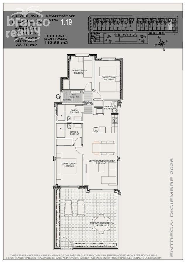 Nový rezidenční komplex v Torrevieji, pouhý 1 km od moře Moderní apartmány se 2 a 3 ložnicemi Tento nový rezidenční komplex se nachází v pulzující čtvrti Altos del Sol v Torrevieji a nabízí řadu apartmánů se 2 a 3 ložnicemi. Jednotky v přízemí mají soukromé zahrady, zatímco jednotky v horním patře mají soukromá solária pro exkluzivní relaxaci venku. Komplex navíc zahrnuje jeden řadový dům, který uspokojí ty, kteří hledají více prostoru a soukromí. Každá jednotka zahrnuje podzemní parkovací místo a volitelné úložné prostory. Prostorné společné prostory a vybavení pro rodiny s dětmi Rezidenční komplex je promyšleně navržen s dostatkem společných prostor a upravenými zahradami, které vytvářejí klidné prostředí. Rodiny si mohou užít velký společný bazén s vyhrazenou dětskou zónou, ideální pro relaxaci a trávení času pod teplým středomořským sluncem. Komplex se nachází asi 1 km od pláže „Playa de Los Locos“ a nabízí obyvatelům pohodlný přístup na pláž. Špičkové povrchové úpravy a energeticky úsporné prvky Tyto domy vynikají svou vysoce kvalitní povrchovou úpravou a důrazem na detail. Každá jednotka je vybavena fotovoltaickým solárním panelem o výkonu 600 W, který poskytuje ekologické energetické řešení. Mezi další prémiové prvky patří vestavěné grily na soláriích, obrněné vchodové dveře, vestavěné skříně s vnitřním vybavením, koupelnový nábytek se sprchovými zástěnami a podlahové vytápění v koupelnách, které zajišťují pohodlí a styl v každém koutě. Ideální poloha v blízkosti služeb a atrakcí Tento komplex se nachází v blízkosti všech základních služeb, což z něj činí výhodnou polohu jak pro stálé obyvatele, tak pro ty, kteří hledají rekreační bydlení. Altos del Sol je známý svou dobrou dopravní dostupností s místními obchody, restauracemi a zábavními podniky v docházkové vzdálenosti. Letiště Alicante-Elche je vzdálené 45 minut jízdy (43 km) a nákupní centrum Habaneras je vzdálené pouhé 3 km a nabízí komplexní nákupní zážitek. Zažijte středomořský životní styl v Torrevieji Torrevieja, která se nachází v jižním Alicante, nabízí typický středomořský zážitek. S více než 300 slunečnými dny v roce a průměrnou roční teplotou 20 °C si obyvatelé mohou užívat krásného počasí po celý rok. Město je proslulé svou bohatou gastronomií, která zahrnuje čerstvé suroviny z moře i místních farem. Torrevieja se navíc pyšní malebnými plážemi, promenádami, muzei a řadou aktivit vhodných pro rodiny s dětmi, což zajišťuje životní styl plný volného času a relaxace. Prozkoumejte Torrevieju. Ať už hledáte pulzující přímořskou komunitu nebo klidné útočiště, tento developerský projekt nabízí jedinečnou příležitost vychutnat si to nejlepší z pobřežního kouzla Torrevieji. Zažijte vše, co toto krásné město nabízí, od teplého klimatu až po bohaté kulturní a kulinářské dědictví.