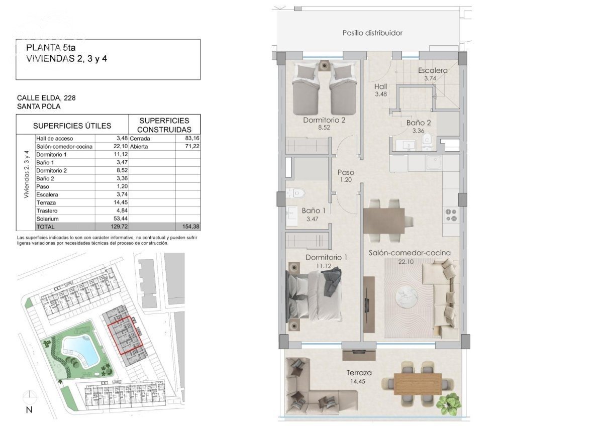 NOVOSTAVBA REZIDENČNÍHO KOMPLEXU V SANTA POLA Moderní uzavřený rezidenční komplex zahrnující 3 bloky bytů s velkými upravenými společnými prostory včetně bazénu s vodními postelemi, dětského hřiště, pergoly a parkování kol. Rezidenční komplex nabízí apartmány se 3 a 2 ložnicemi, oba typy mají 2 koupelny, otevřenou kuchyň s obývacím pokojem, vestavěné skříně, terasu a parkovací místo. K dispozici je společná zahrada, bazén s plážovým vstupem, sprchy a velká dřevěná pergola. Součástí komplexu jsou upravené plochy s palmami a vegetací, všechny osvětlené. V centrální části bazénu se nachází mělčí oblast s vodními postelemi. Obec Santa Pola se nachází na oblíbeném pobřeží Costa Blanca u Středozemního moře, jižně od Alicante a v regionu Bajo Vinalopó. Město má záviděníhodnou geografickou polohu, je obklopeno přírodní krajinou a má zvláštní mikroklima, které nabízí mírné klima po celý rok. Jeho městské centrum je ohraničeno hradem a přístavem na východě a západě a je ohraničeno přírodním parkem Santa Pola Salinas a pohořím Sierra a Cabo de Santa Pola, starobylým útesem, který se dnes vyznačuje listnatými borovicemi. Santa Pola se nachází 21 km od Alicante, hlavního města provincie s vynikající infrastrukturou, a 15 km od mezinárodního letiště „Elche-Alicante“.