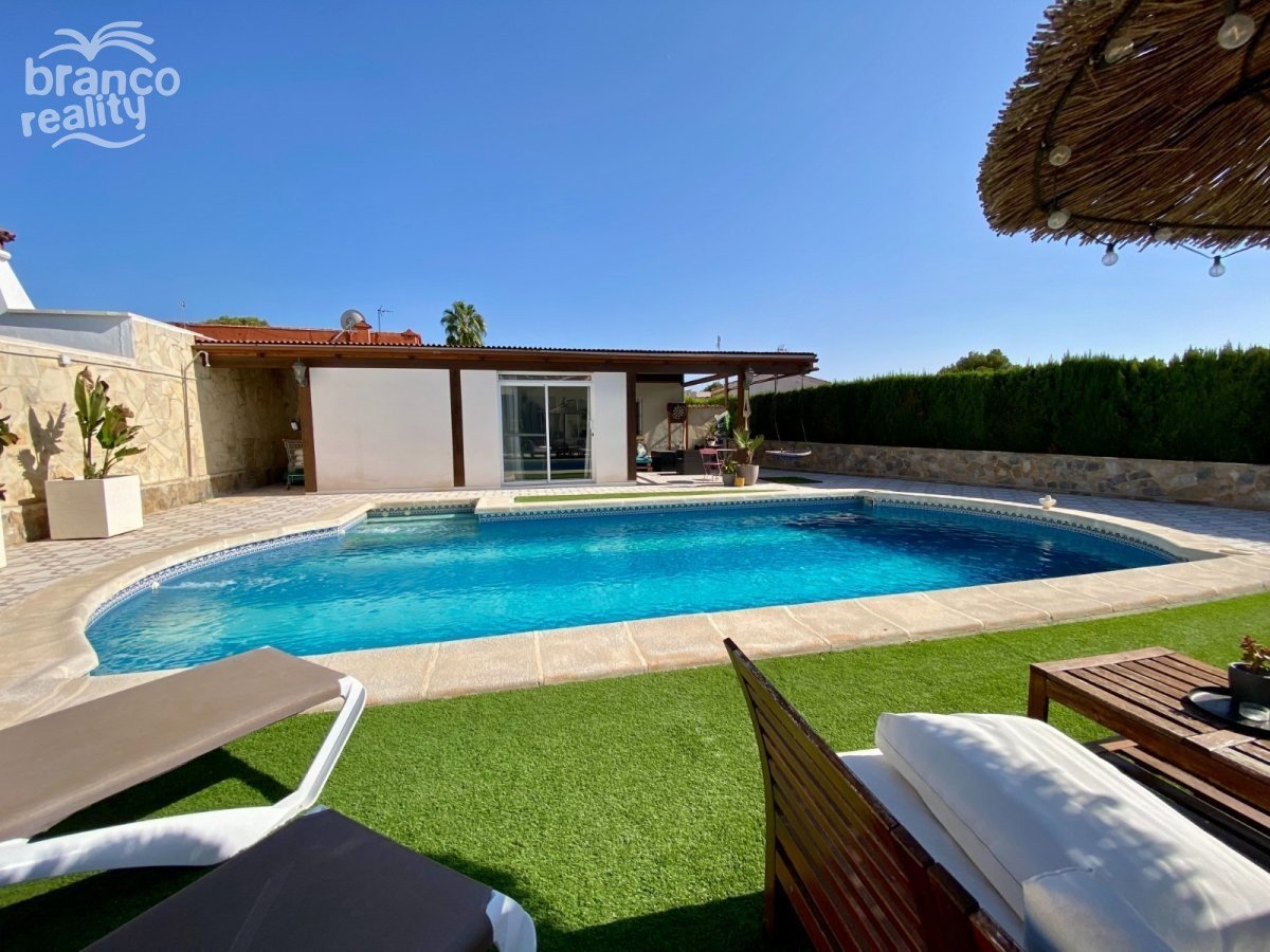 Samostatně stojící vila s chatou pro hosty, bazénem a garážemi – 2 minuty od centra Quesady Tato prostorná samostatně stojící vila se nachází na soukromém pozemku o rozloze 834 m², jen kousek pěšky od centra Ciudad Quesada. Nabízí flexibilní možnosti bydlení, včetně plně samostatné chaty pro hosty. Hlavní dům nabízí 3 dvoulůžkové ložnice a 2 koupelny, velký obývací pokoj s jídelnou a plně vybavenou kuchyň. Samostatná chata (casita) zahrnuje 1 ložnici, 1 koupelnu, vlastní kuchyň a úložný prostor – ideální pro širší rodinu, hosty nebo k pronájmu. Venku najdete bazén se slanou vodou a kryté posezení s pergolou – ideální pro relaxaci a zábavu. Součástí nemovitosti jsou také dvě soukromé garáže. Dům byl postaven v roce 1987 a byl dobře udržován. V poslední době proběhly modernizace, včetně interiéru chaty, terasy a střechy garáže (vše zrekonstruováno v posledních dvou letech). Klíčové detaily: Pozemek: 834 m² Zastavěná plocha: cca. 250 m² 3 ložnice / 2 koupelny v hlavním domě 1 ložnice / 1 koupelna + kuchyň v chatě pro hosty Bazén se slanou vodou 2 garáže + další parkování Orientace na jih 2 minuty chůze do centra Quesady 10 minut na pláž 30 minut na letiště Alicante V docházkové vzdálenosti od veškeré občanské vybavenosti Solárium Jedná se o solidní, dobře situovanou vilu s vynikajícím potenciálem pro bydlení i pronájem. Prohlídky možné po domluvě.