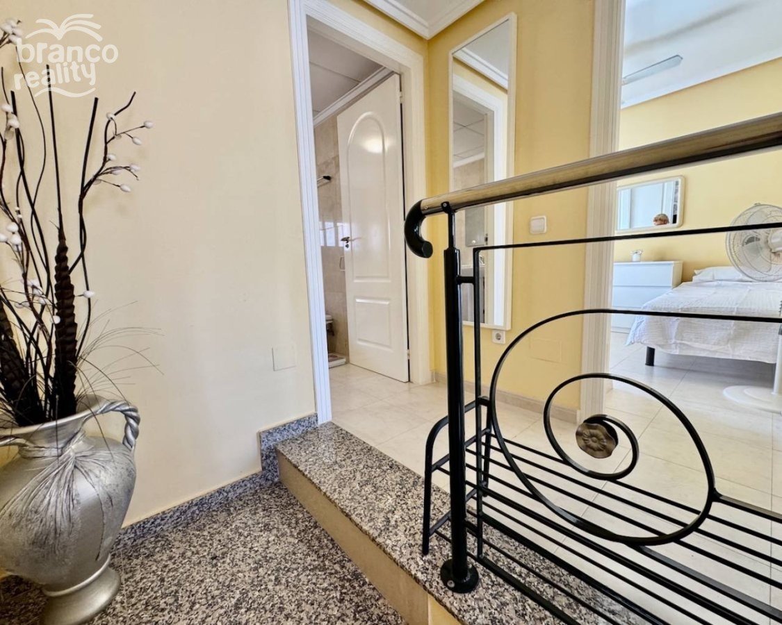 Tento bezvadný dům se 3 ložnicemi a 2 koupelnami, nacházející se v zabezpečeném uzavřeném komplexu, nabízí dokonalou kombinaci komfortu, stylu a praktičnosti. Nemovitost o rozloze 101 m², postavená na pozemku o rozloze 200 m², je ve výborném stavu a připravena k nastěhování. Po vstupu dovnitř najdete světlý obytný prostor orientovaný na východ, plně vybavenou samostatnou kuchyň s bílým zbožím a praktickou technickou místnost. Všechny tři ložnice jsou vybaveny vestavěnými skříněmi a klimatizace a stropní ventilátory zajišťují celoroční pohodlí. Venku si obyvatelé mohou užívat krásně udržované společné zahrady, třpytivý bazén a dostatek společného parkování. Z nemovitosti je také krásný výhled na bazén a nábytek je k dispozici k domluvě. Klíčové vlastnosti: 3 ložnice a 2 koupelnyDům o rozloze 101 m², pozemek 200 m²Otočení na východ s výhledem na bazénSamostatná kuchyň s vybavením + technická místnostKlimatizace a stropní ventilátoryUzavřený komplex se společným bazénem a parkovánímVynikající stav, nábytek dohodouLokace:Tento dům se nachází v ideální poloze pro relaxaci i pohodlí, pouhých 10 minut od pláže, 30 minut od letiště, 5 minut od místních služeb a 10 minut od golfových hřišť.