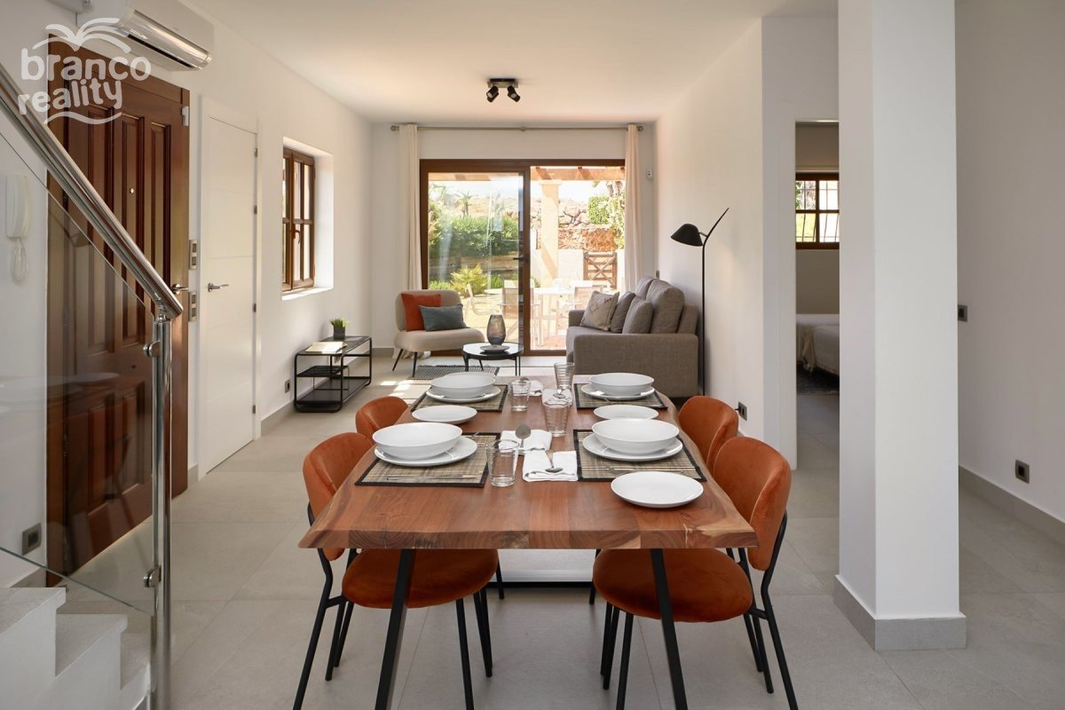 Objevte krásu a eleganci této okouzlující třípokojové vily, která se nachází v prestižním resortu Desert Springs, jediném oceňovaném rodinném resortu a pouštním golfovém hřišti v Evropě. Exteriér vily, navržený v autentickém stylu „casas del campo“ v údolí Almanzora, se vyznačuje velkými terasami a pergolami, které vzdávají hold tradiční architektuře regionu, zatímco interiér představuje elegantní, moderní domov s moderní estetikou. Tato nádherná vila nabízí prostornou hlavní ložnici s výstupem na velkou terasu, krásně upravenou soukromou zahradu a dostatek prostoru pro stolování pod širým nebem. Interiér je obložen vysoce kvalitními dlaždicemi Porcelanosa a je plně vybaven klimatizací, dvojitými okny, moderní kuchyní a bezpečnostními prvky pro klid. Tato vila se třemi prostornými ložnicemi, včetně hlavní ložnice s vlastní koupelnou, dvěma luxusními koupelnami a otevřeným obývacím a jídelním prostorem, dokonale kombinuje pohodlí a styl. Obyvatelé si budou moci užívat přístup ke společnému bazénu, soukromému střešnímu soláriu s úchvatným výhledem a krásně udržovaným společným zahradám. K nemovitosti patří také vyhrazené podzemní parkovací místo a nachází se v uzavřeném komplexu s 24hodinovou ostrahou. S celkovou podlahovou plochou 111 m² a střešní terasou o rozloze 76 m² nabízí tato vila prostor i soukromí. Vila, která kombinuje tradiční kouzlo s moderním luxusem, představuje jedinečnou příležitost užít si život v jednom z nejexkluzivnějších evropských pouštních golfových resortů. Ceny se řídí dostupností. Pro více informací nás kontaktujte.
